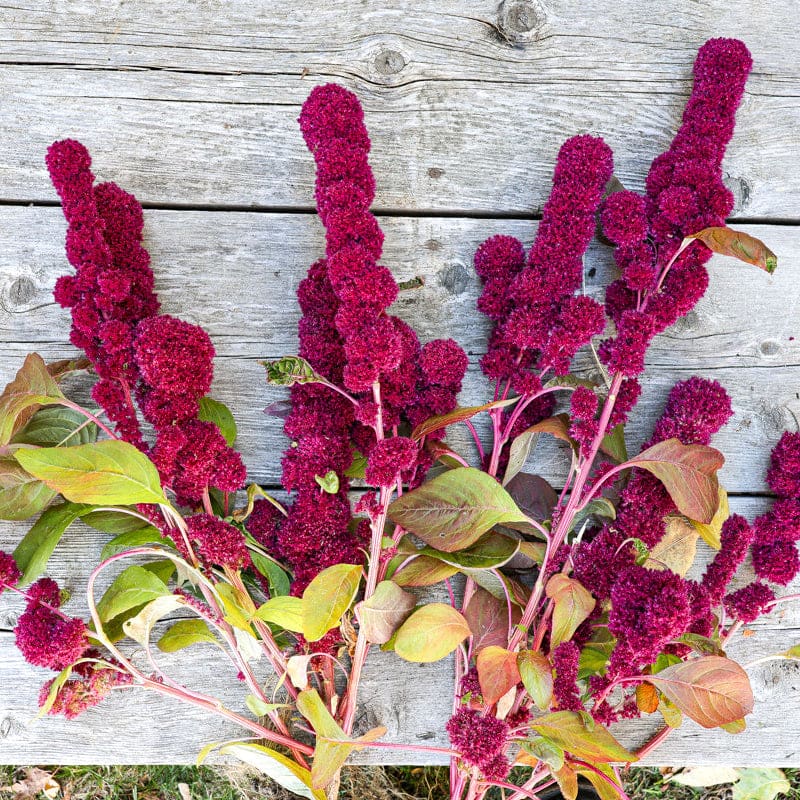 Huge dark burgundy red plumes look as if an elephant is raising its trunk into the air. The Elephant Head Amaranth is a long-timer bloomer that grows to 5 feet, grabbing attention in the garden. It is also an excellent cut flower. An heirloom that was brought here from Germany in the 1880s.
