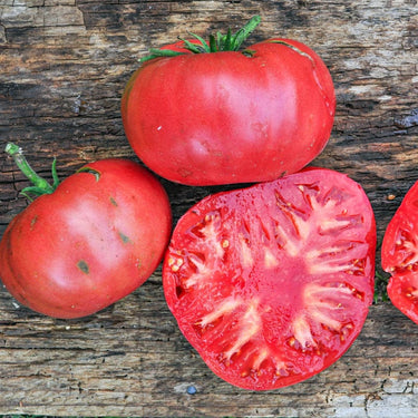 The Climbing Triple Crop Tomato is a Beefsteak type with a very long, 10 to 15-foot vine. You can grow these tomatoes much as you would pole beans or cukes on a sturdy trellis, with a yield of several bushels per plant. The Climbing Triple Crop Tomato is large, meaty, and sometimes an oddly shaped red fruit with a pleasant, somewhat acidic flavor that you associate with Beefsteak types.