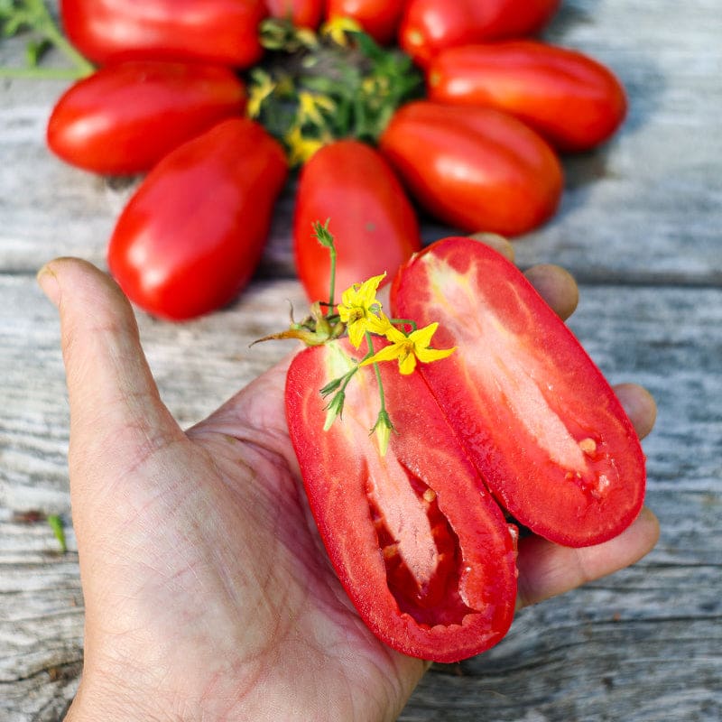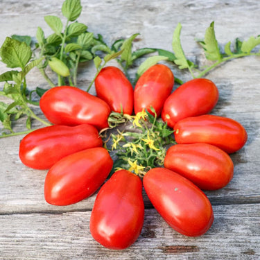 This Italian heirloom paste tomato is widely known and popular despite its lack of disease resistance. The fruit's mild and pleasant tomato flavor is prized for cooking down into sauces and purees and is famous for canning. San Marzano has vigorous vines carrying clusters of small, 1 ½ by 3 ½” lobed, elongated fruits with firm flesh, and open seed cavity with very few seeds. Yields are very high.