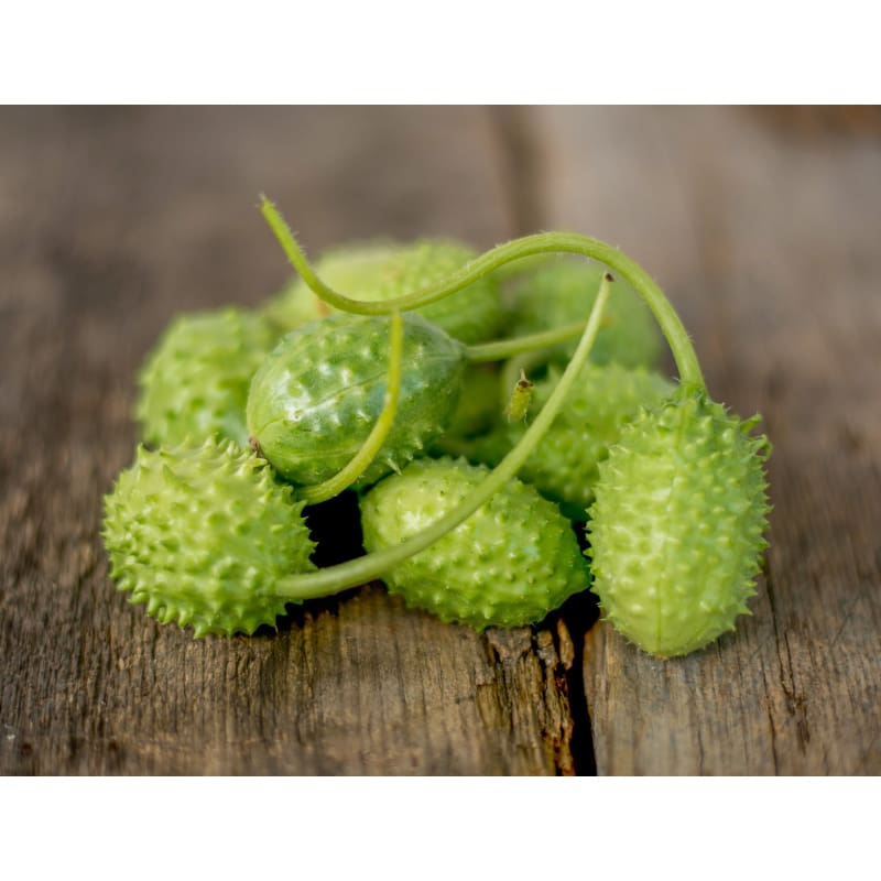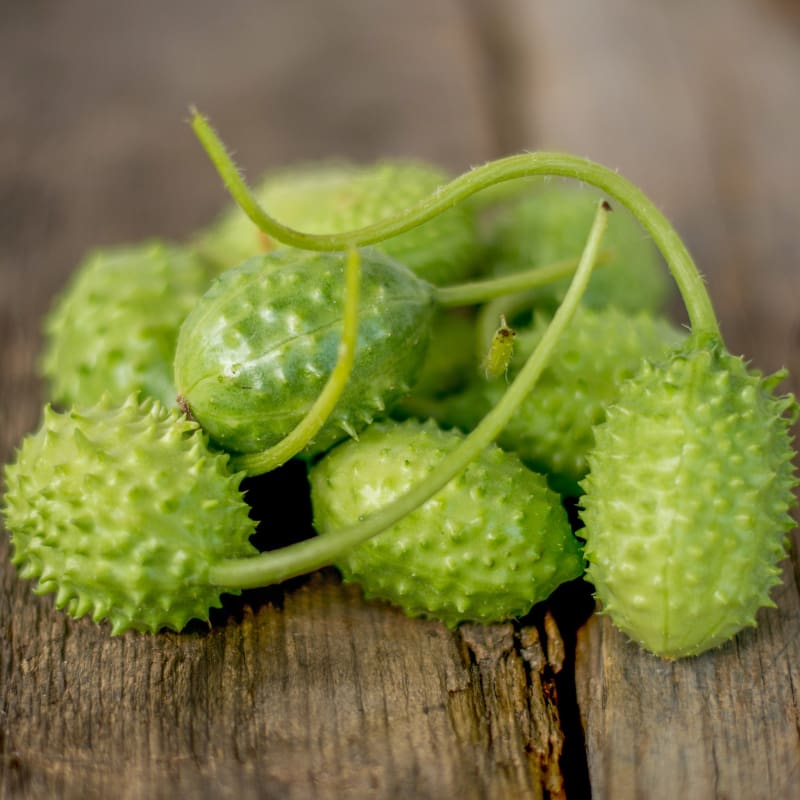 The West India Gherkin Cucumber is a 1793 Heirloom. Although this variety has been sold in the US since the early 1800’s, we suspect it will appear unique to most home gardeners. The leaves don’t resemble cucumber leaves at all; they look like watermelon leaves. Vines are long and bear multitudes of small oval fruit which are exceptionally spiny. Used for unusual and good tasting pickles, the West India Gherkin Cucumber will also add a bit of a surprise to a salad.