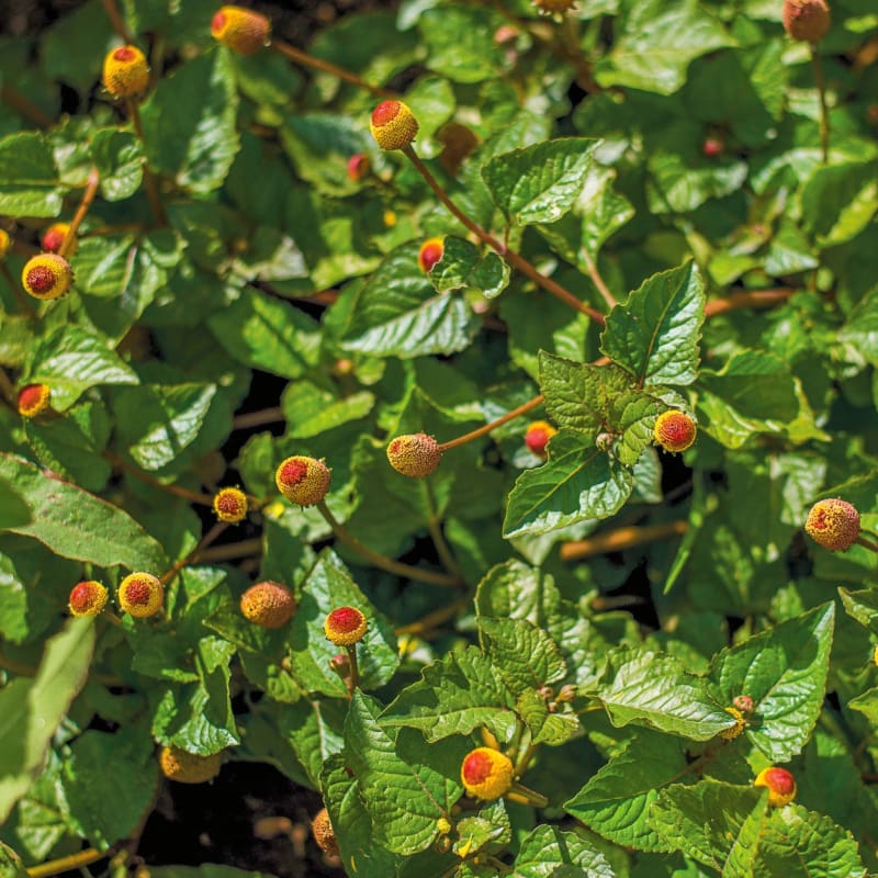 This annual produces bronze green foliage and olive shaped flowers with a burgundy eye. Unique flowers make superb bedding or container plants. The leaves and flowers numb the mouth and are said to work better than many commercial products. Toothache Plant also has antibiotic, antifungal, and anti-inflammatory properties.
