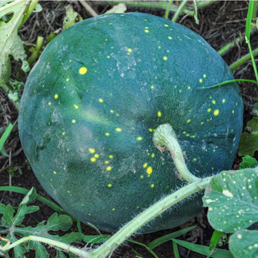 This 1910 Amish heirloom watermelon's rind is a deep green with yellow dots, some large (moons) and some tiny (stars), hence the name. Foliage is mottled as well. Last year we harvested a 28 pound melon from our trials. The Moon & Stars Watermelon has a very sweet flavor, along with its unusual appearance, giving it a lot of notoriety in recent years.