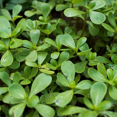 The Red Gruner Purslane has upright stems with a pretty red tone and large, soft green, fleshy leaves. Pick and use as needed for mixed salads or garnish a gourmet dish. A juicy, very tasty addition to salads. It's interesting that some of the peskiest weeds from our gardens are cultivated and valued as delicacies elsewhere. This culivated purslane bears little resemblance to the weed. Much more erect, with very large, meaty leaves, and the flavor is really wonderful, a bit citric. Purslane is harvested over a long period.