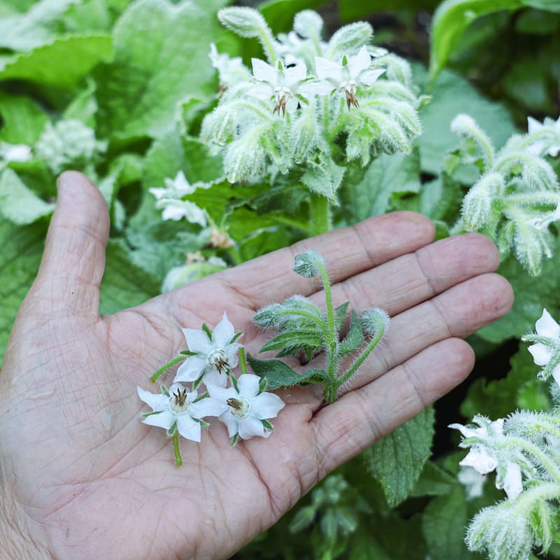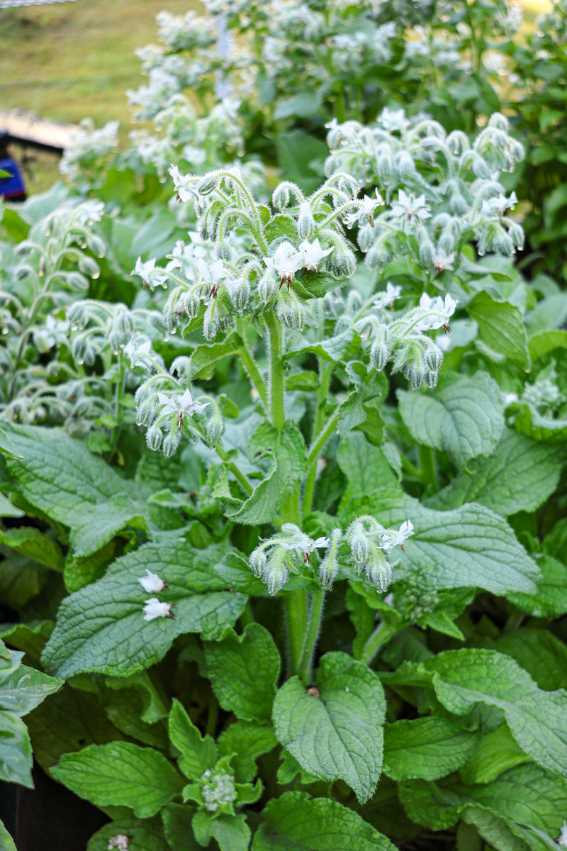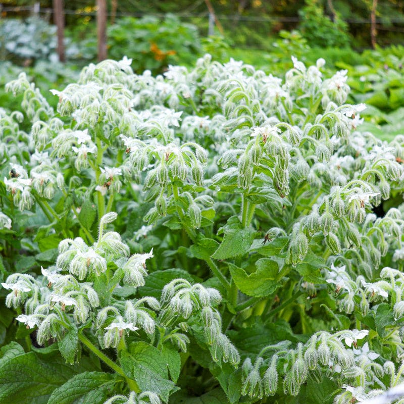 Borage is about 3 feet tall with a spreading habit. Continuous pure white blooms attract lots of bees. Tough and drought resistant, it reseeds itself easily. Borage grows as an ornamental as well as for the fuzzy, cucumber-tasting leaves in the spring. This is a great seed to sow during mid-summer for end-of-season blooms for you and the late-season native insects.