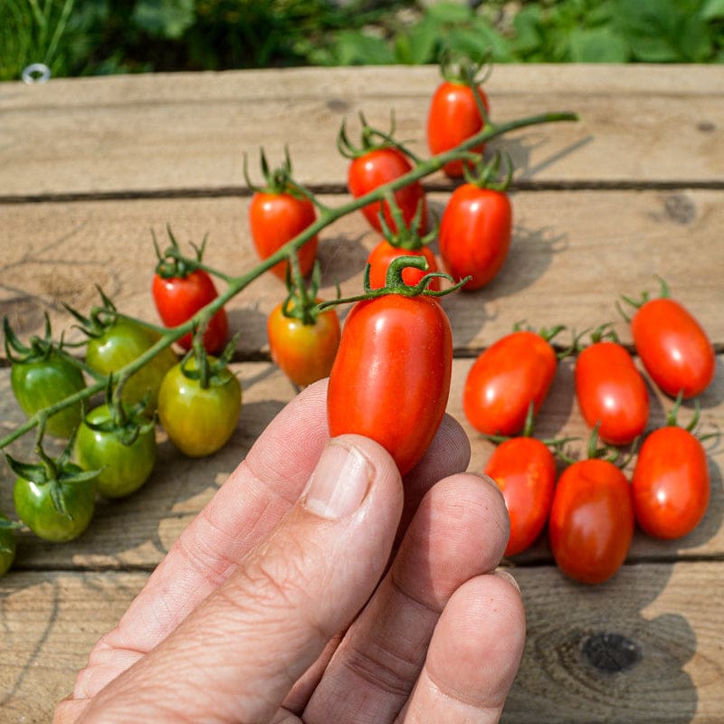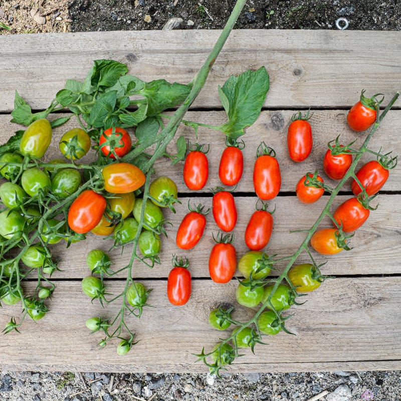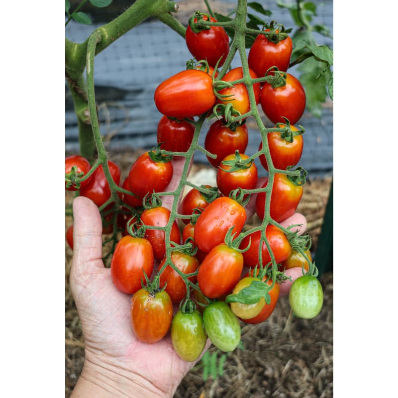Candy Bell is the ideal grape tomato with long trusses of sweet fruits, 9 on the Brix scale. Our plants even grew some double trusses that held a total of 26 tomatoes and I have eaten half of them while writing this, so yummy! Little to no pruning is required for these strong, super-producer plants. Consistent fruit size with good crack tolerance and some disease resistance. Verticillium and Fusarium races 1 & 2.