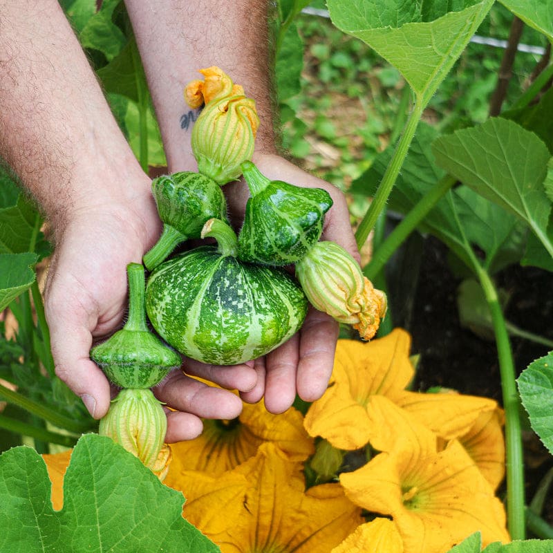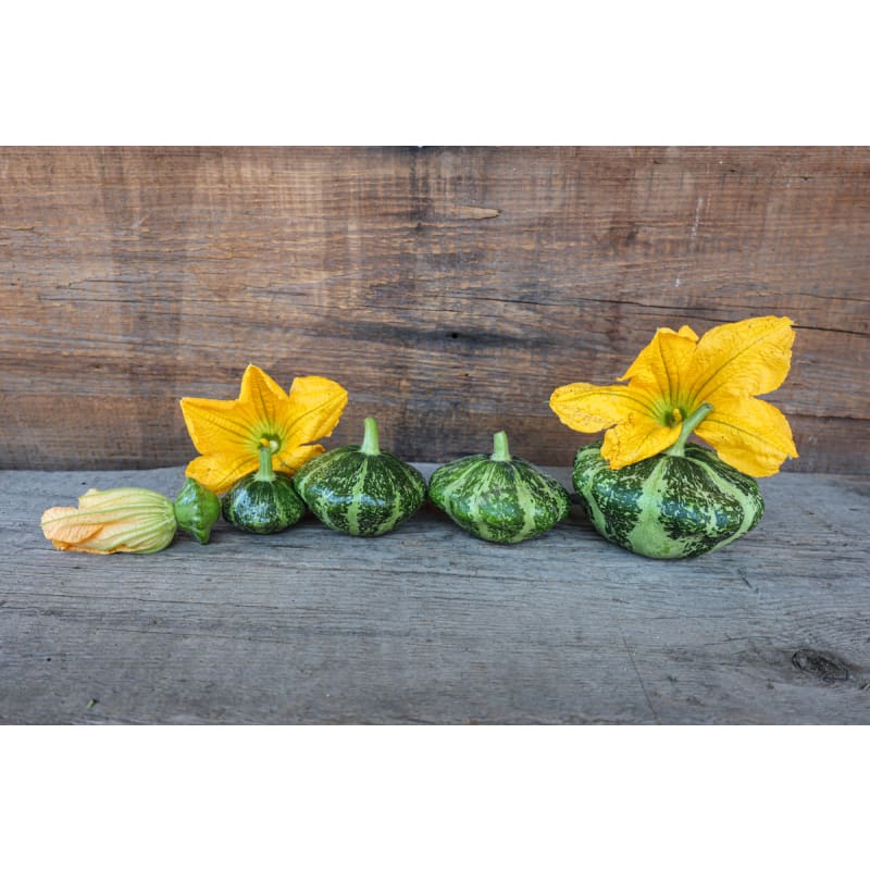 Green Lightning Squash is a 2025 AAS Winner, and unlike any other patty pan squash, one of the first to have such vivid, contrasting green striping. Early and fast to produce, one of the first to harvest from the garden, especially when it is started early, 3-4 weeks indoors before transplanting out. Prolific yields and robust flavor on a compact bush habit plant. Harvest at 1-3”.
