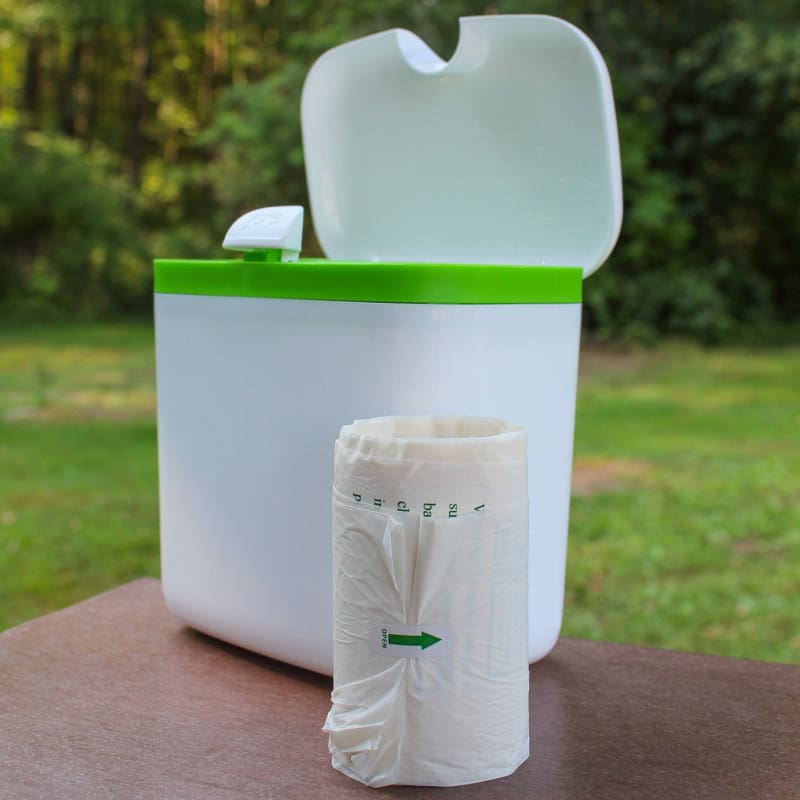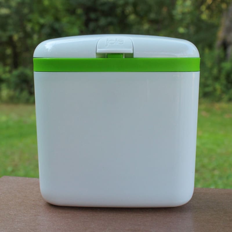 This countertop compost bin allows for easy storage of organic waste indoors. The simple green and white design looks good in any kitchen, and its compact size makes it ideal for any countertop. This bin includes a second rim, ensuring compost bags fit neatly inside and with no overhang. Lid features a locking button mechanism to seal in odors. Dishwasher safe for easy cleaning. Comes with 50 standard size compost bags. Capacity is 91 oz. BPA free. Measures 5”L x 6.75”W x 7.5”H.