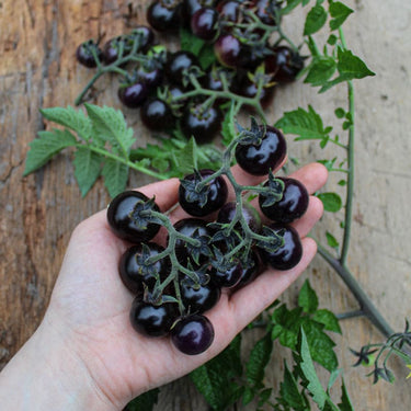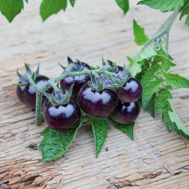 The Blueberries Tomato is part of our Indigo series. These extraordinary blue almost black tomatoes will be some of the most unique varieties you have ever grown. They were developed with traditional selection and breeding techniques at Oregon State University, beginning in the 1960s from crossing cultivated tomatoes and wild species from Chile and the Galapagos Islands. Young fruits when exposed to sunlight have indigo-purple skin from the pigment Anthocyanin, naturally occurring in blueberries, which is a powerful and beneficial antioxidant. The fruits are ready to harvest when the skin turns bright rosy red on the bottom, shoulders are indigo shaded and the fruit is soft to the touch. Blueberries Tomato produce an avalanche of cherry size, amethyst colored clusters. A nice balanced tomato flavor with a perfect amount of sweetness and juiciness.