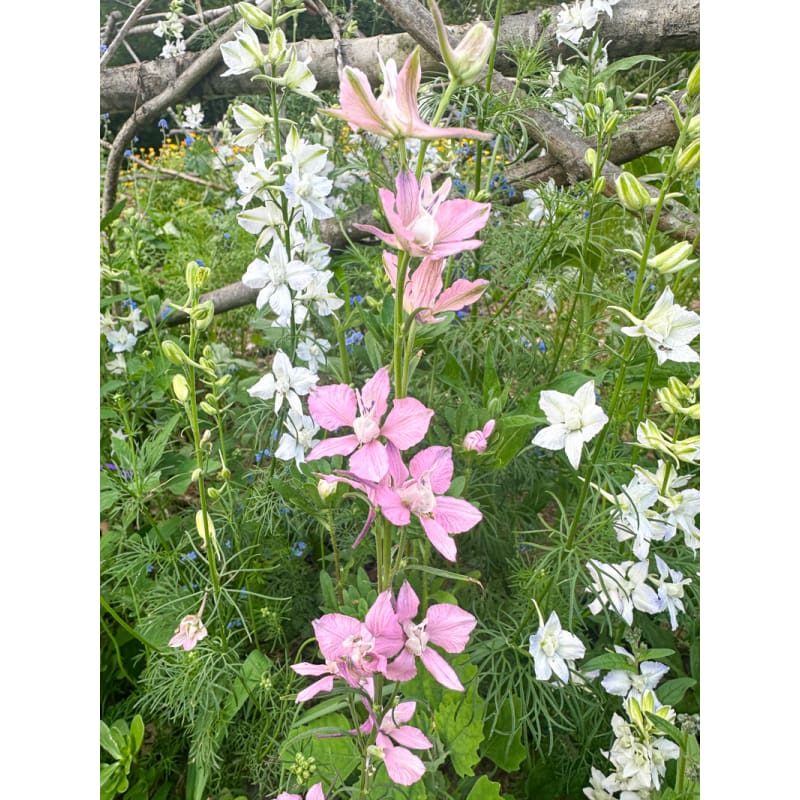 Resembles its perennial cousin the delphinium in bloom but is more delicate. The foliage is quite feathery and light and the colors range from deep blue to pale blue, pink, lilac, and white. These 3 to 4-foot plants need support if stalks are to grow straight. Fantastic drying flower, colors dry vividly and quickly.