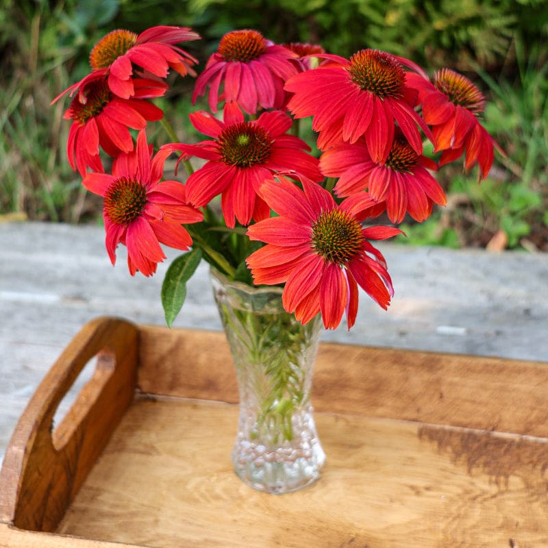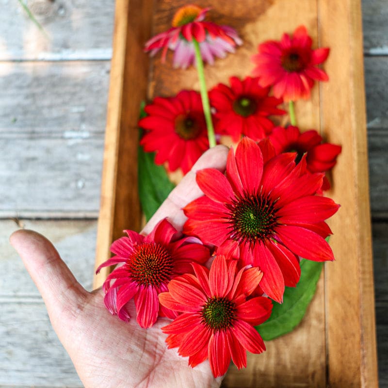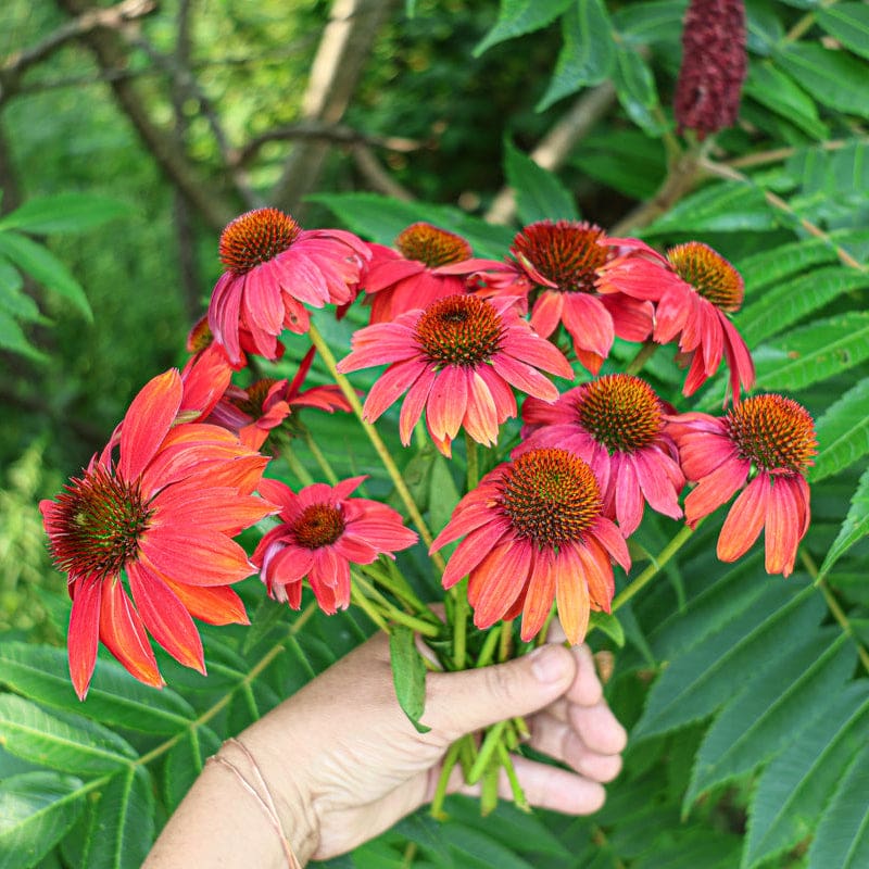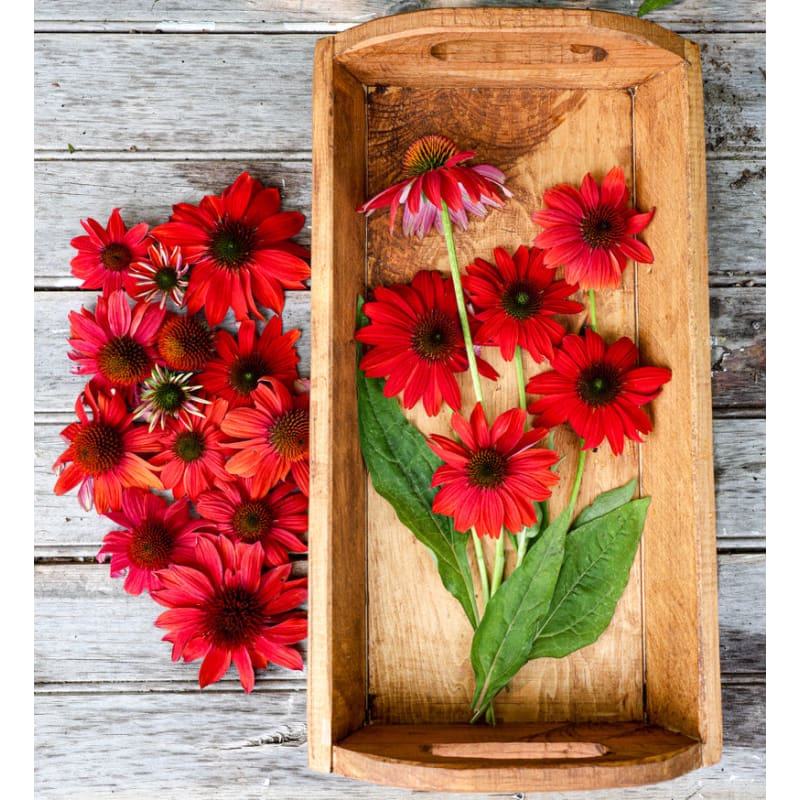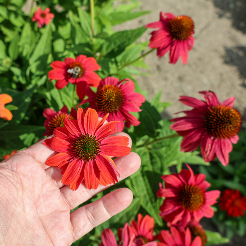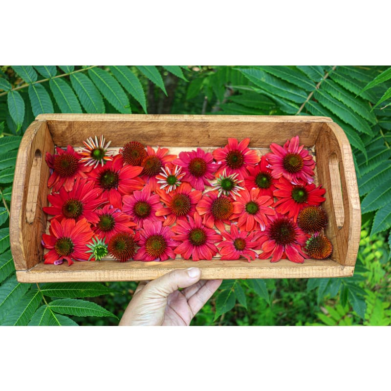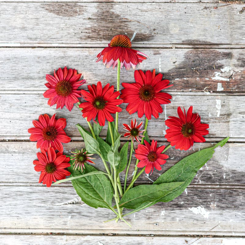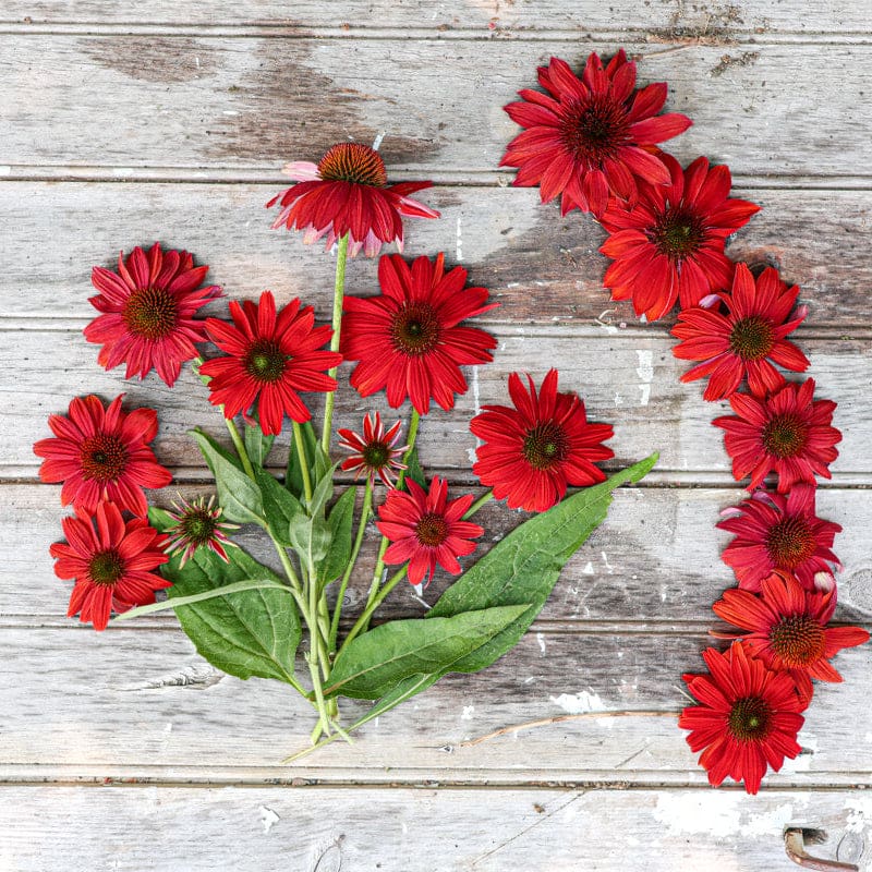 Artisan echinacea is a new series with an elevated performance. This echinacea is easy to grow from seed and has an extremely strong branching structure, making dense, sturdy plants that are jam-packed with long-lasting flowers. Red Ombre Artisan Echinacea has bold and glowing, uniquely colored flowers- crimson red with orangish, pink undertones that slowly fade into softer tones and can bloom in the first year. Grow in the ground or containers.