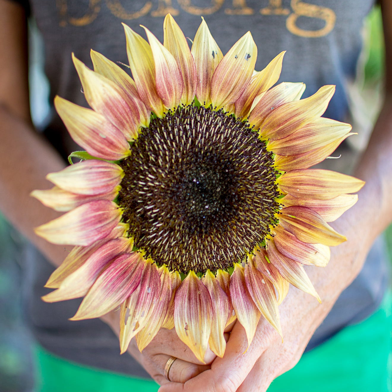 Strawberry Blonde sunflower petals have varying shades of burgundy and pink encircling the dark centers with ivory to pale yellow tips. These eye-catching sunflowers are absolutely beautiful in bouquets. Strong and long stems on 5-6 foot branching plants. Day length neutral and pollenless. These pollen-less sunflowers still attract our buzzing pollinator friends. Though they don't produce pollen, and therefore are safe around those with allergies, they still provide much needed nectar for bees, native pollinators, and butterflies. Planting both types of flowers is an important part of nurturing your garden ecosystem. Hybrid.